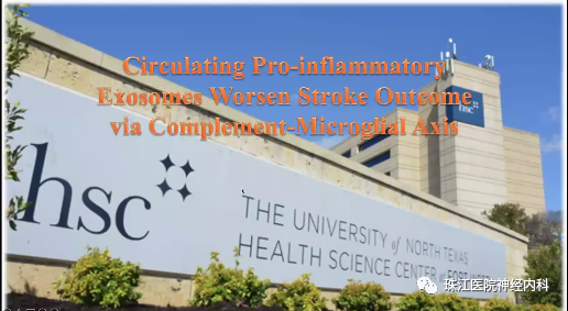 金坤林教授以“Circulating pro-inflammation exosomes worsen stroke outcome via complement-microglial axis”为题,阐述了老化与缺血性卒中的关系,金教授指出研究表明老龄小鼠中提取的外泌体(O-exo)可含有补体系统激活带来的炎性介质,借助血液循环,通过损伤的血脑屏障进入大脑,聚集在缺血半暗带区域并活化小胶质细胞;活化的小胶质细胞通过与神经元相互作用,吞噬神经元,进而导致神经元减少和神经功能缺损。本系列研究在一定程度上回答了为何老年人群发生脑卒中后往往产生更严重的神经功能缺陷和预后不良这一问题。