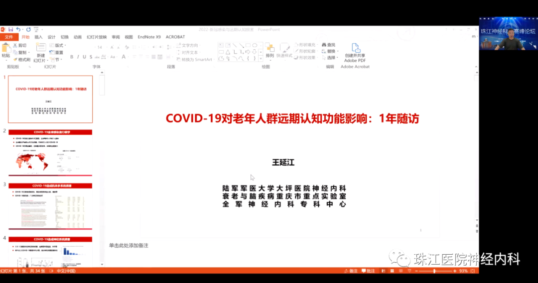来自第三军医大学大坪医院神经内科主任王延江教授以“COVID-19对老年认知功能的远期影响”为题,介绍了一项为期一年随访时间的老年新冠患者认知功能障碍的临床研究。通过研究统计了新冠一年内60岁以上老年患者的新冠发生率,并对新冠患者认知障碍的易感性,危险因素以及新冠感染与痴呆的相关性进行了详细深入的阐述,有助于与会医师清楚认识到对新冠与认知障碍的联系,并对新冠病毒的感染更为重视,令与会者受益良多。