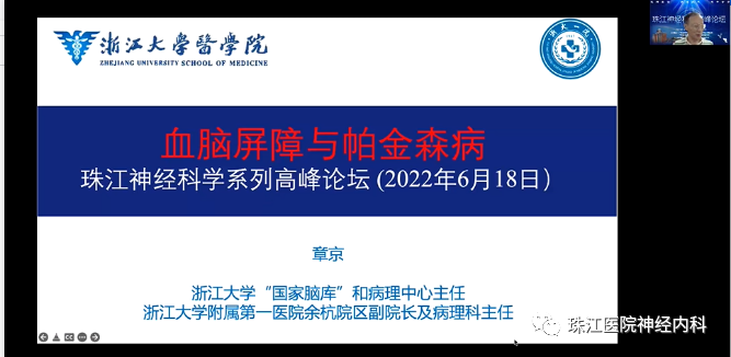 浙江大学“国家脑库”和病理中心主任、浙江大学附属第一医院余杭院区副院长及病理科主任章京教授为我们带来了“血脑屏障与帕金森病”的讲题,分别从动物水平和细胞水平详细地为大家讲了两篇血脑屏障与帕金森病的关系。血脑屏障(BBB)的破坏与包括帕金森病(PD)在内的各种神经退行性疾病的发病机制有关。寡聚α-突触核蛋白会导致星形胶质细胞显著活化,从而增加VEGFA和NO的产生和释放,这两种物质都会破坏BBB完整性。这些结果表明,VEGFA和NO(主要是VEGFA的下游介质)是BBB保护的潜在有吸引力的治疗靶点。