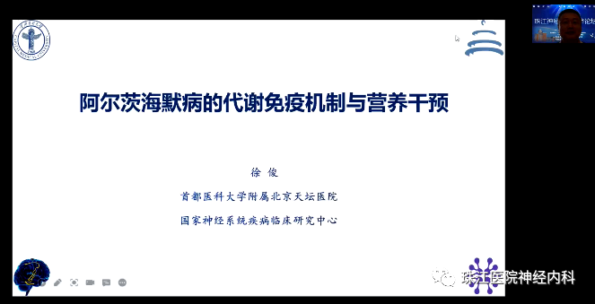 徐浚教授以“阿尔兹海默症的最新研究进展”为题,提出最新研究的血源性标志物有许多方面新的进展,但是目前公认的还是Aβ和p-tau具有一定的临床价值。目前发现脑肠轴对从大脑发育开始起作用,对大脑功能和许多神经病学起着重要的作用,可能的机制主要有免疫,内分泌系统,神经方面。微生物群对各个系统均有调节作用,其中也参与神经系统的发育和功能,从饮食改变肠道菌群,从而改变了AD标志物,因此要重视AD的营养风险评估并制作营养干预计划。此外还提出了最新研究的认知障碍预后评估体系,可有效指导临床精准治疗。