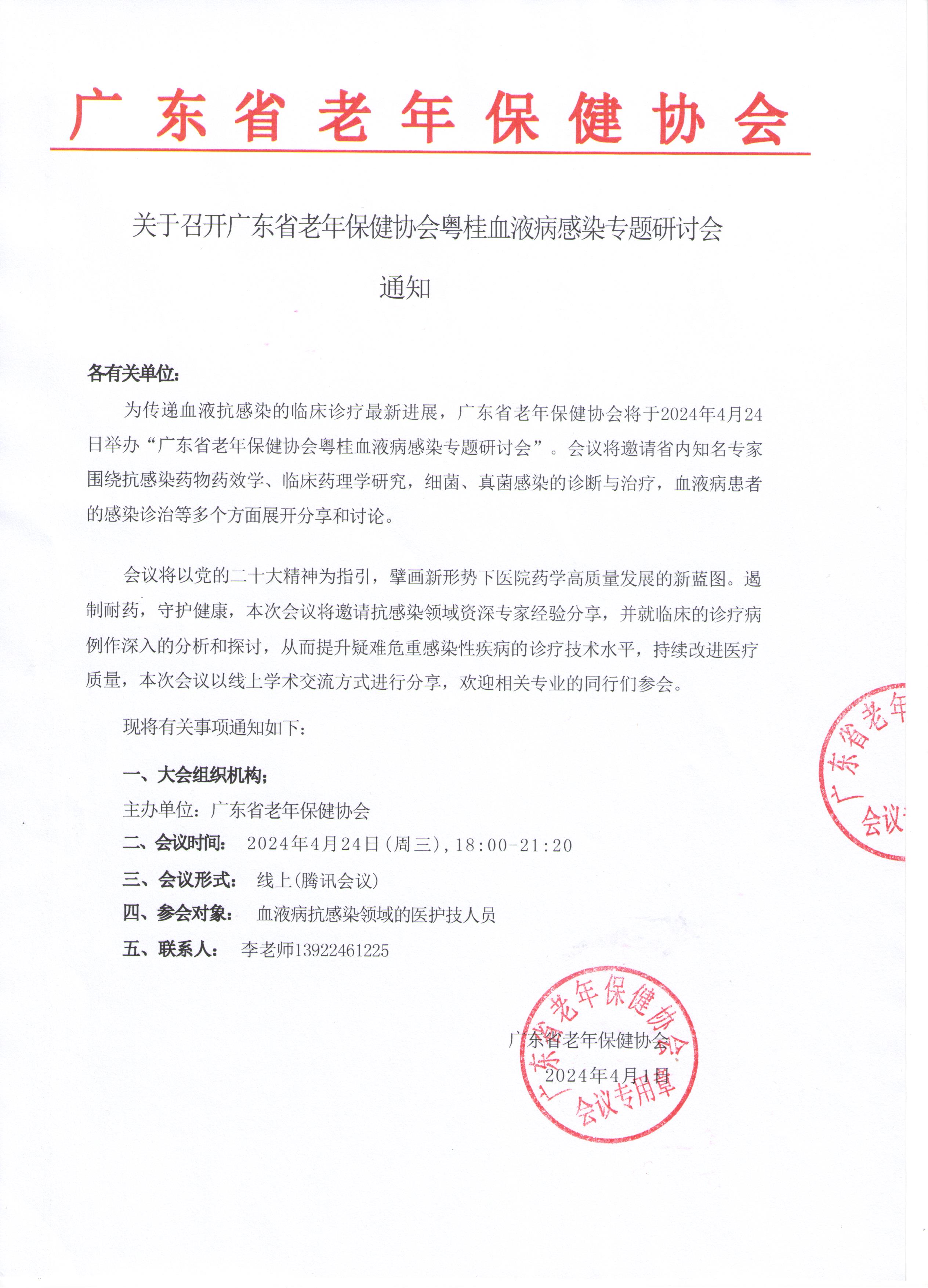关于召开广东省老年保健协会粤桂血液病感染专题研讨会的通知