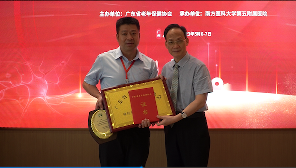 上图为南方医科大学第五附属医院党委书记李绍波、广东省老年保健协会神经外科专业委员会主任委员蒋文武教授共同颁发名誉主任委员聘书