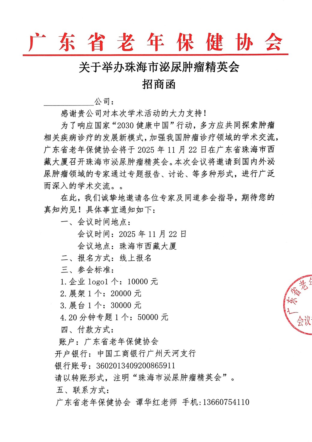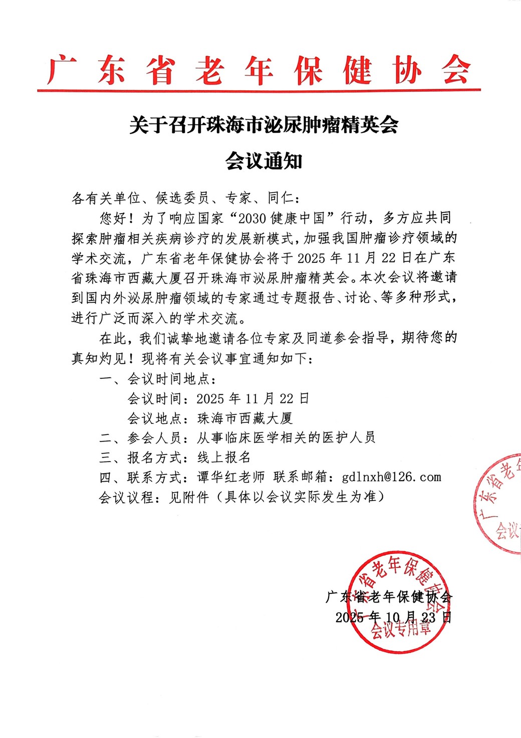 关于召开珠海市泌尿肿瘤菁英会会议通知及招商函